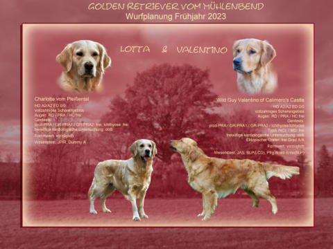 Der D-Wurf ist geplant für Sommer 2025 mit Buffy. Der Decktermin war am 13. Mai, die Geburt wäre dann Mitte Juli, Abgabe Mitte bis Ende September. Als Vater haben wir Luca (Scorch Trials at DW) gewählt: Ein vorzüglich gebauter Rüde aus einer italienischen Dual-Purpose-Linie mit einem eindrucksvollen Rüden-Kopf, sehr freundlichem Wesen, ausgeglichenem Temperament und hervorragenden Gesundheitszeugnissen.Wir erwarten aus dieser Verpaarung gesunde Welpen, von kräftig goldener Farbe, die Arbeitsfreude gepaart mit einer gesunden Mischung aus Temperament und Ruhe und viel Will to please mitbringen.Wenn Sie sich für einen Welpen aus meiner Zucht interessieren, sollten Sie unbedingt Spaß an gemeinsamen, hunde- und retrievergerechten Aktivitäten mit ihrem Hund mitbringen, damit dieser entsprechend beschäftigt und ausgelastet wird. Sei es nun bei der Dummy-Arbeit, jagdlichen Arbeit oder anderen Hundesportarten. Als reine Familienbegleithunde ohne sinnvolle Beschäftigung sind sie aufgrund ihres Temperaments nicht geeignet!Bei Interesse an einem Welpen aus einem Wurf, kontaktieren Sie mich gerne frühzeitig, am Besten mit einer möglichst aussagekräftigen Mail ( mail at retriever-vom-muehlenbend.de ).Was verstehe ich unter „aussagekräftig“? Als kleinen Leitfaden sollte Ihre Anfrage wenigstens zu diesen Punkten Auskunft geben:•wer sind wir / wer gehört alles zum „Rudel“•wo wohnen wir •wie wohnen wir•wer geht welcher Beschäftigung nach und wie lange•haben wir schon Hundeerfahrung, wenn ja welche•warum wollen wir einen Hund•warum wollen wir einen Golden Retriever•was sind unsere Pläne/Vorstellungen für das gemeinsame Leben und die Beschäftigung mit einem Hund